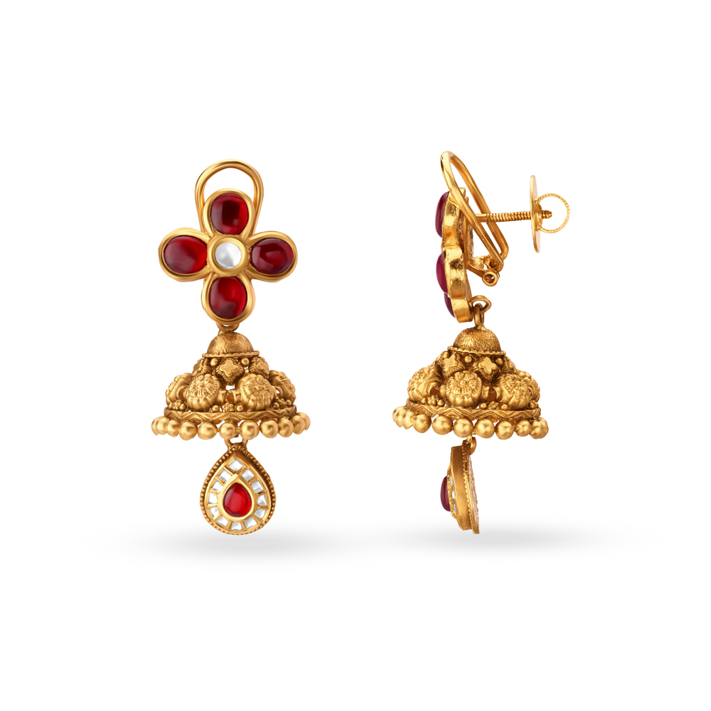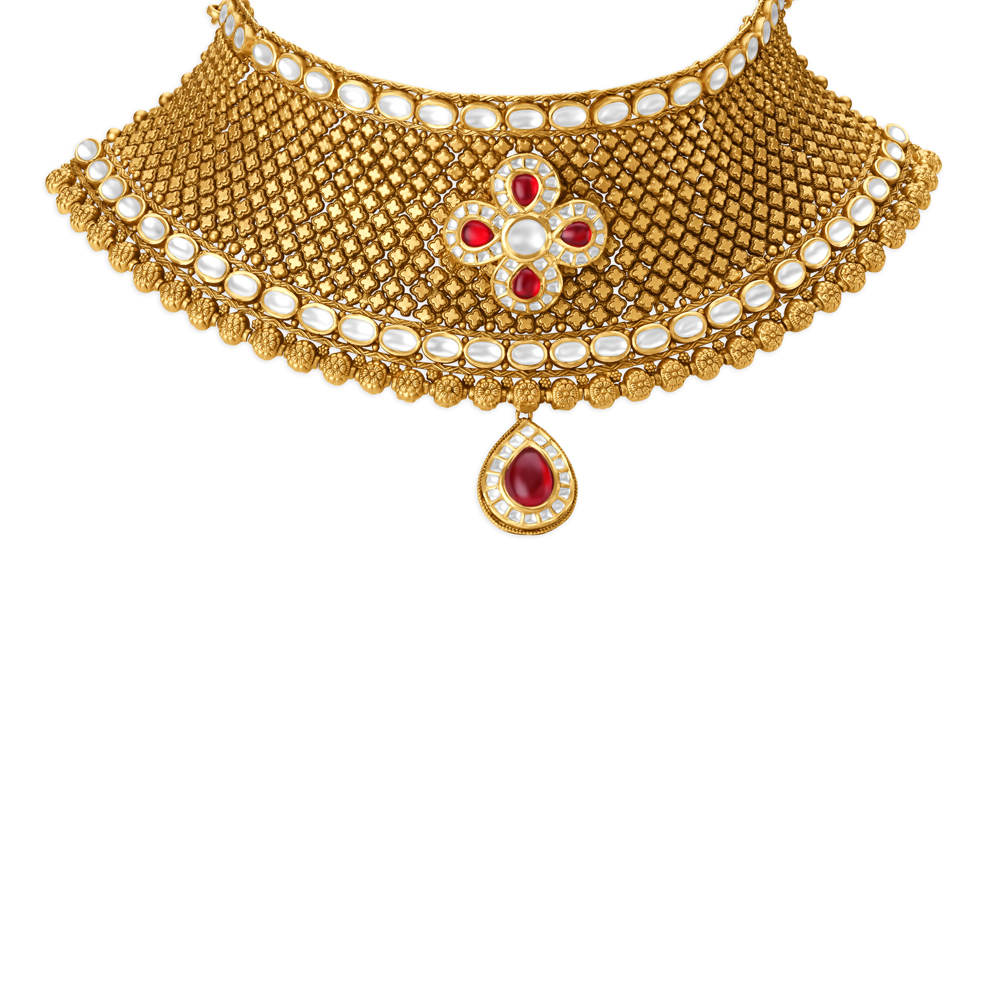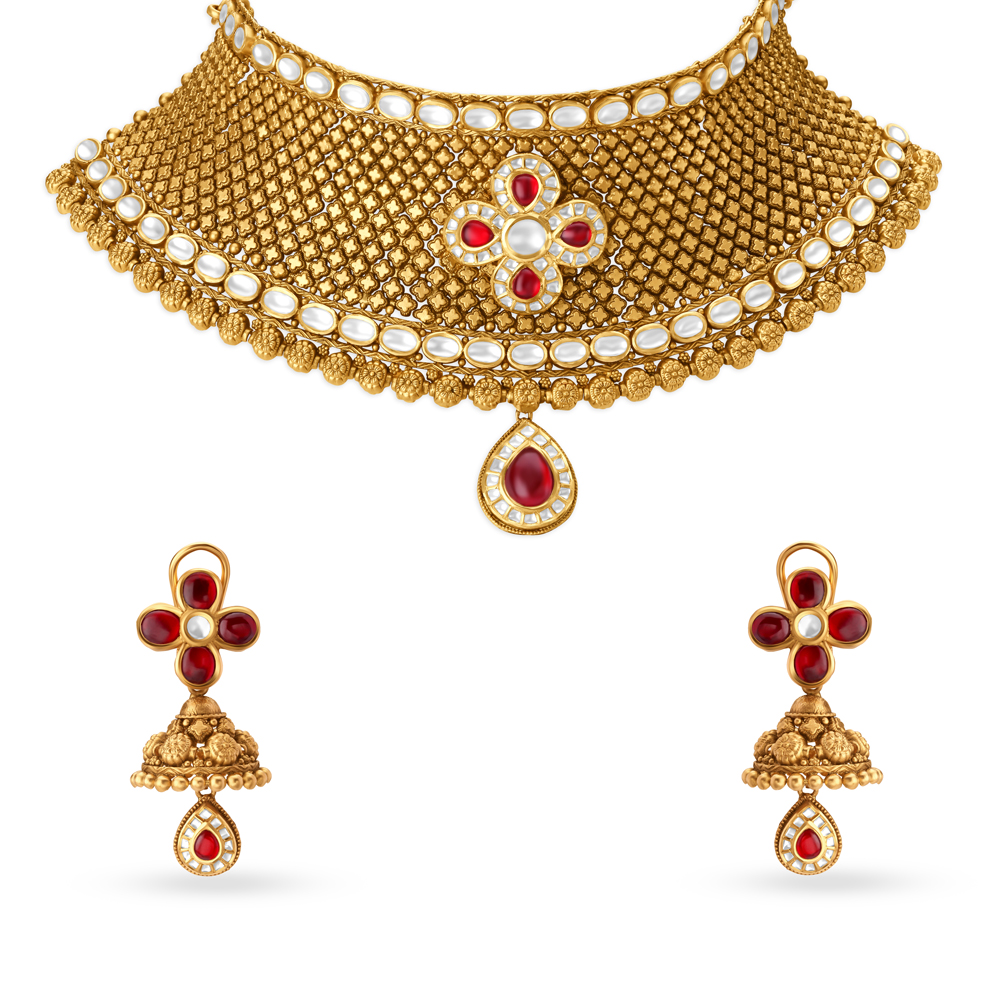 Choker style Necklace and earrings set with kundan stones set in 22 karat yellow gold. A floral motif sets on an elaborate gold mesh to form this set.
