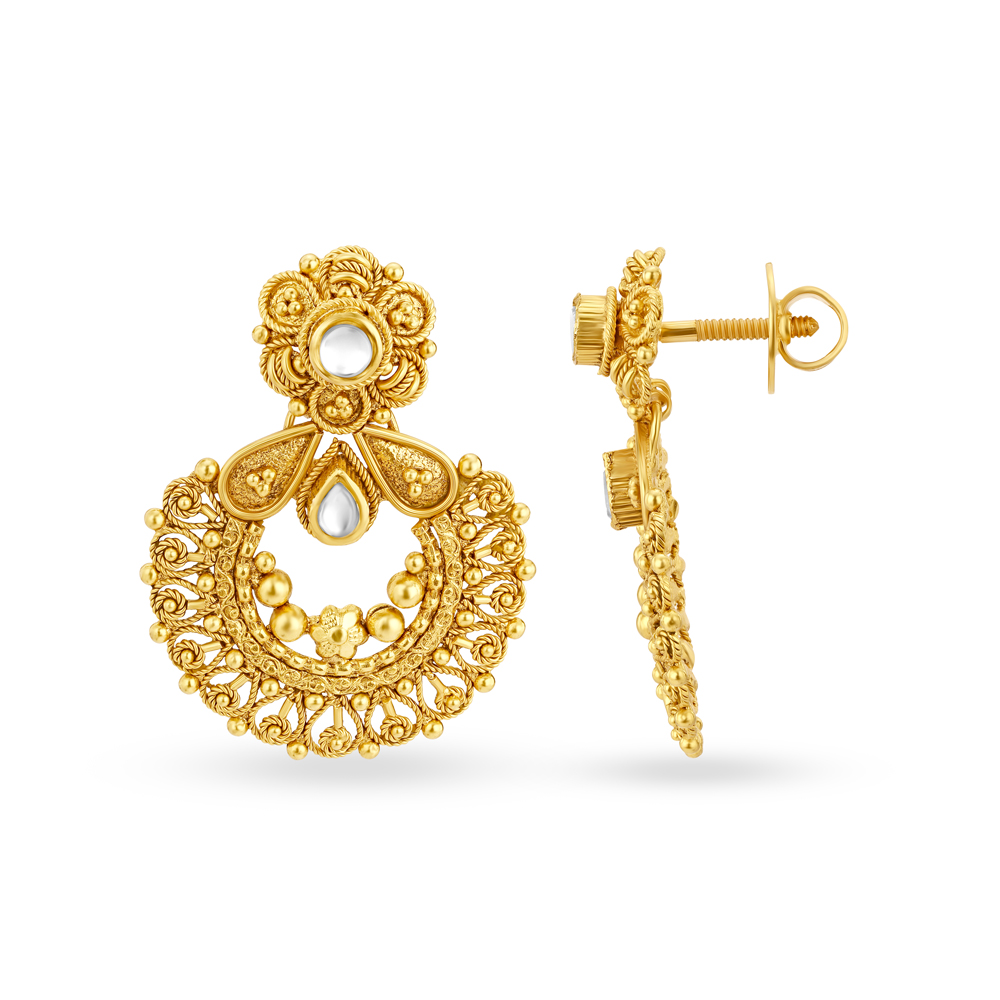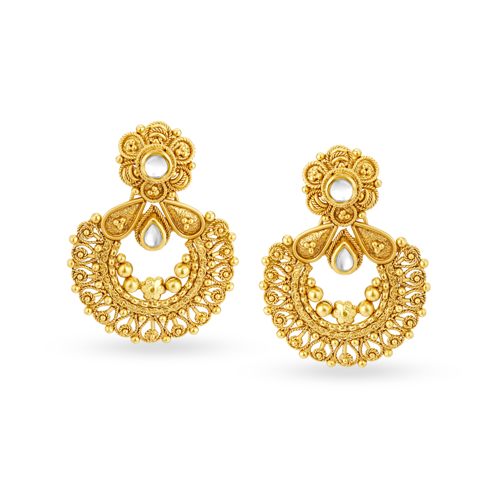 Nature Inspired Drop Earrings with Kundan Stones Crafted in 18 Karat Yellow Gold comes in a fine matte finish.